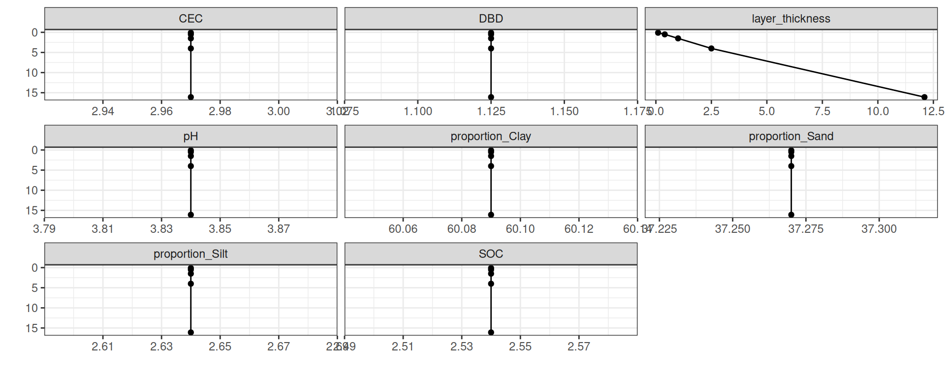 Silt: proportion of silt (%)Clay: proportion of clay (%)Sand: proportion of sand (%)SOC: soil organic content (g)DBD: dry bulk density (kg)pHCEC: cation exchange capacity (cmolC)# A tibble: 5 × 8