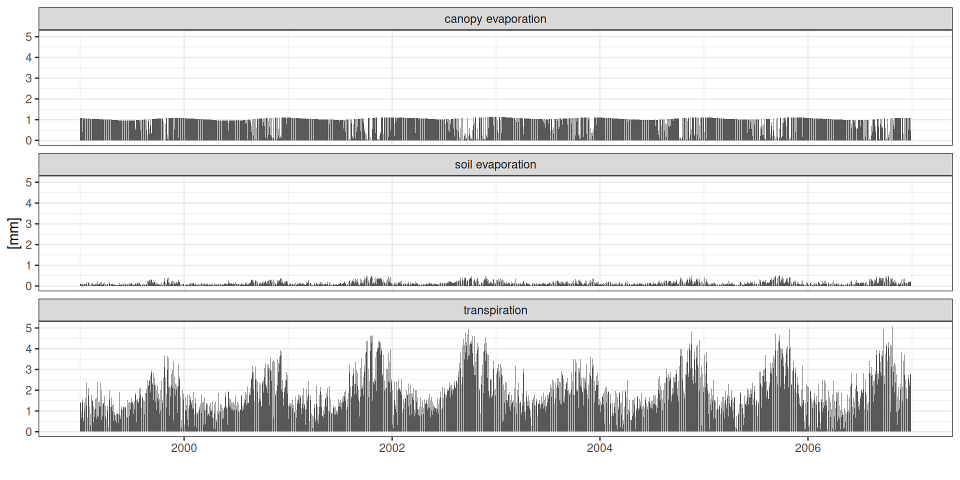 select(date, transpiration, "soil evaporation", "canopy evaporation") %>%
