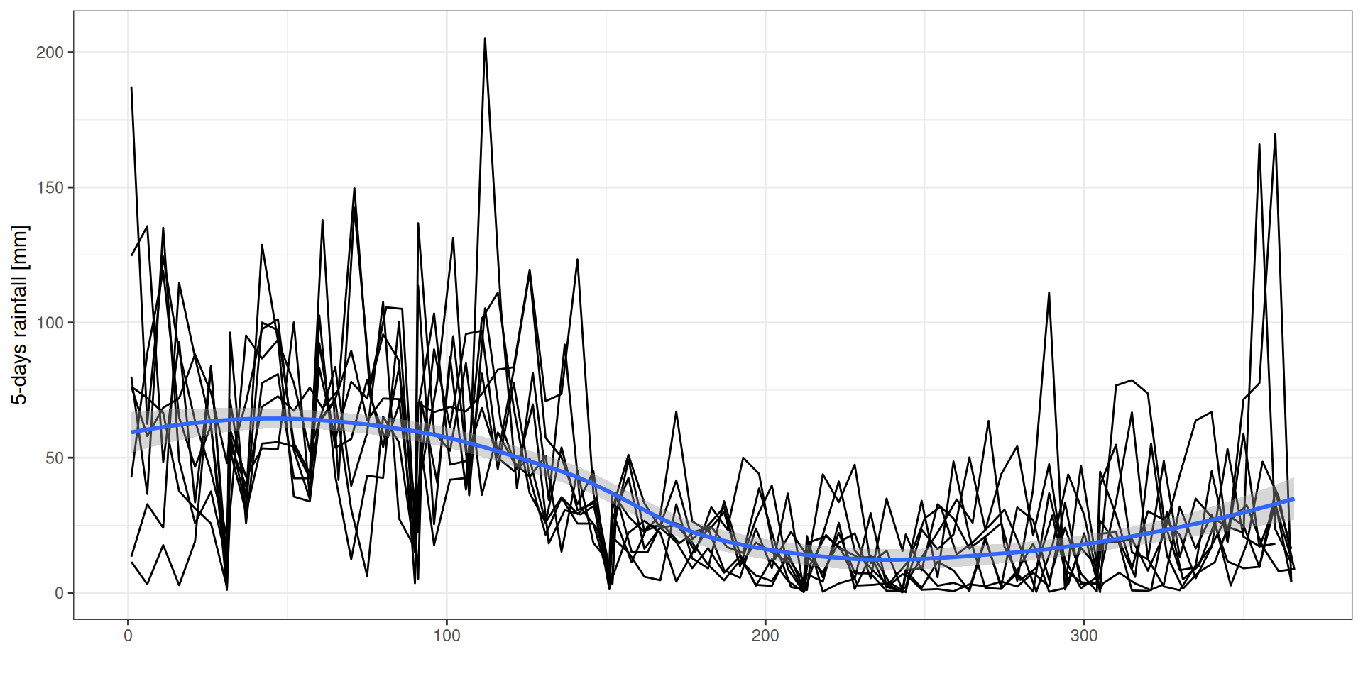 geom_smooth() + xlab("") + ylab("5-days rainfall [mm]")