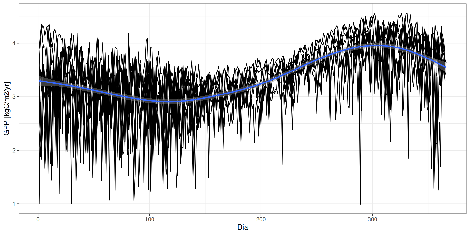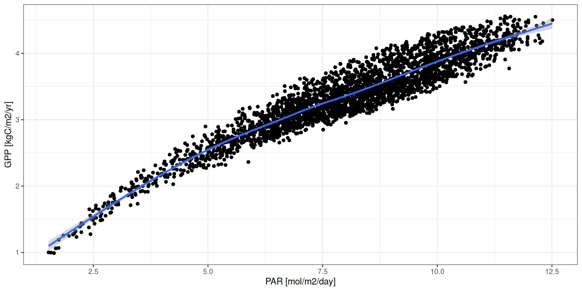 geom_smooth() + xlab("PAR [mol/m2/day]") + ylab("GPP [kgC/m2/yr]")