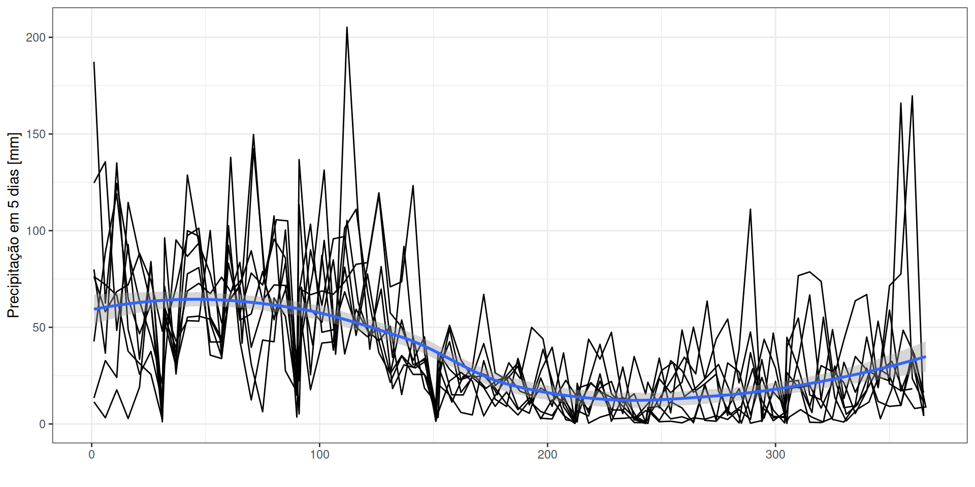 geom_smooth() + xlab("") + ylab("Precipitação em 5 dias [mm]")